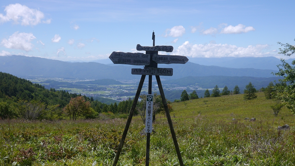 標識によると八子ヶ峰まで20分、最終目的地の白樺湖まで2時間となっていた。