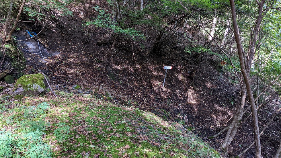 舗装林道の路肩に車を停め、取り合えず金山鉱泉跡を目指す。