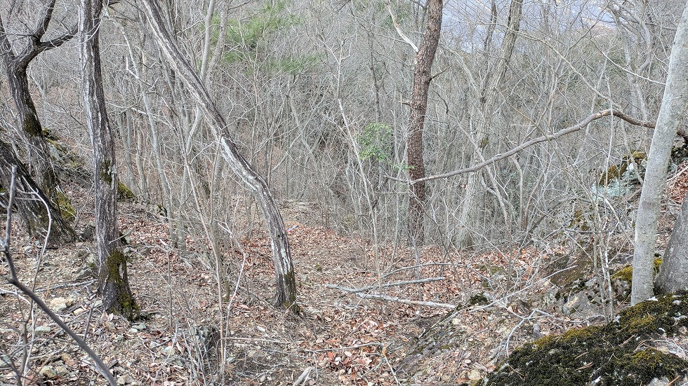 斜面には山道は、なく申し訳ない程度の踏み跡が付いていた。
