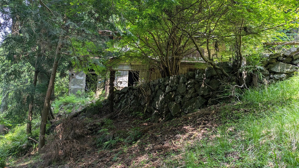 チェーンで塞がれ進入禁止になっていたがここを右に行けば最初の方に出てきた小屋の残骸の所に至ると思う。