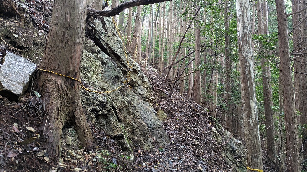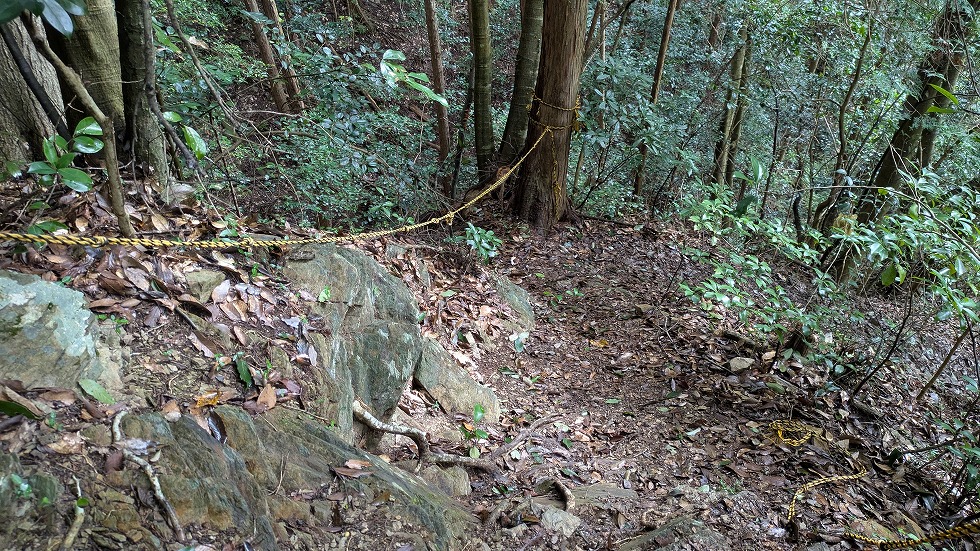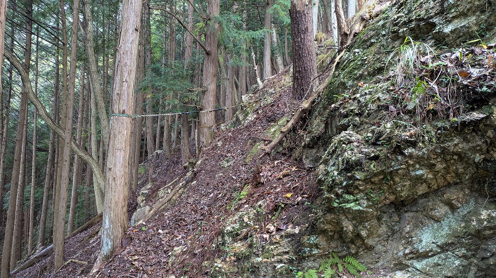 尾根の手前は岩場のやや狭いルートでお助けロープが設置されていた。