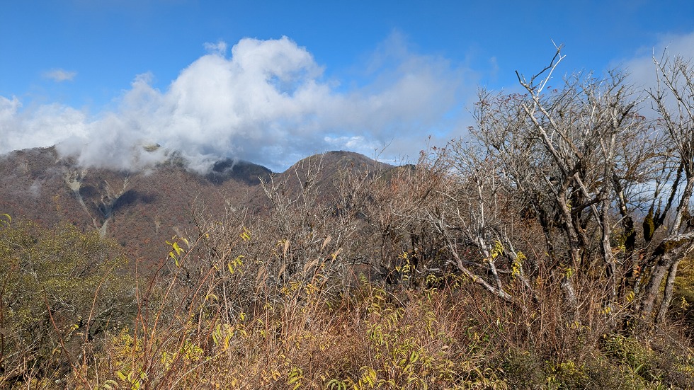 鍋割山が間近になるとガスがなくなり、蛭ヶ岳が視界に入ってくる。