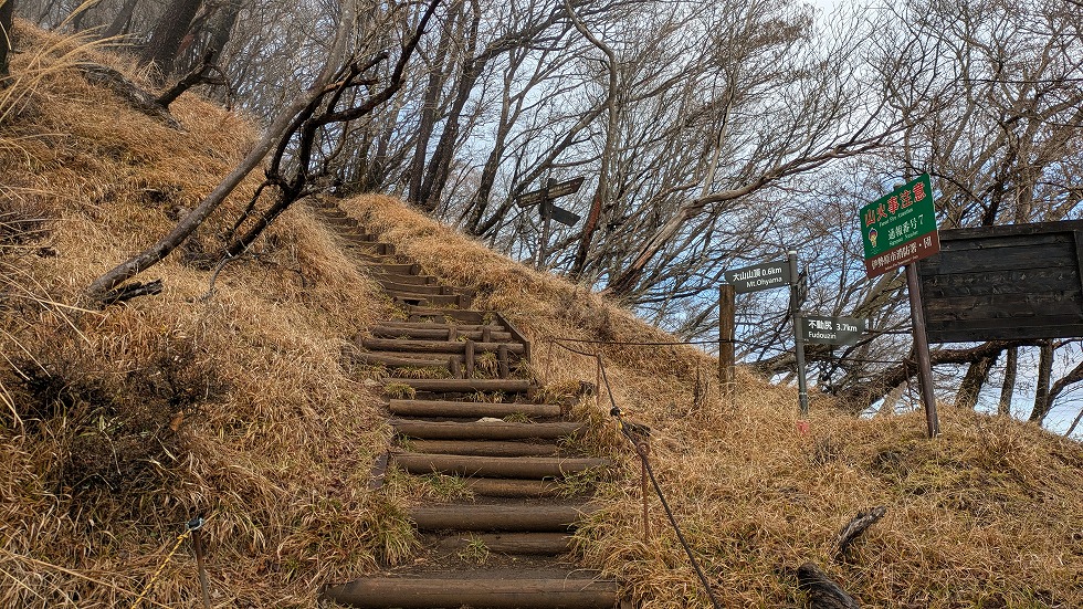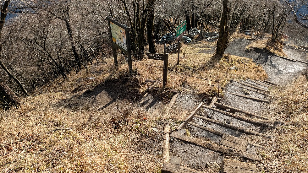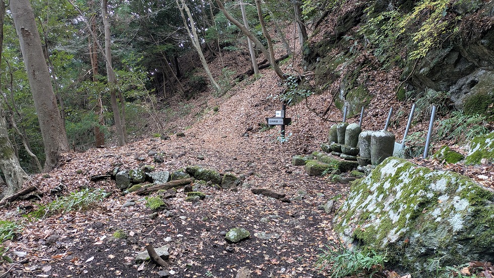 登山口から100m程度、高度を上げた所で舗装路を斜めに横断する。
