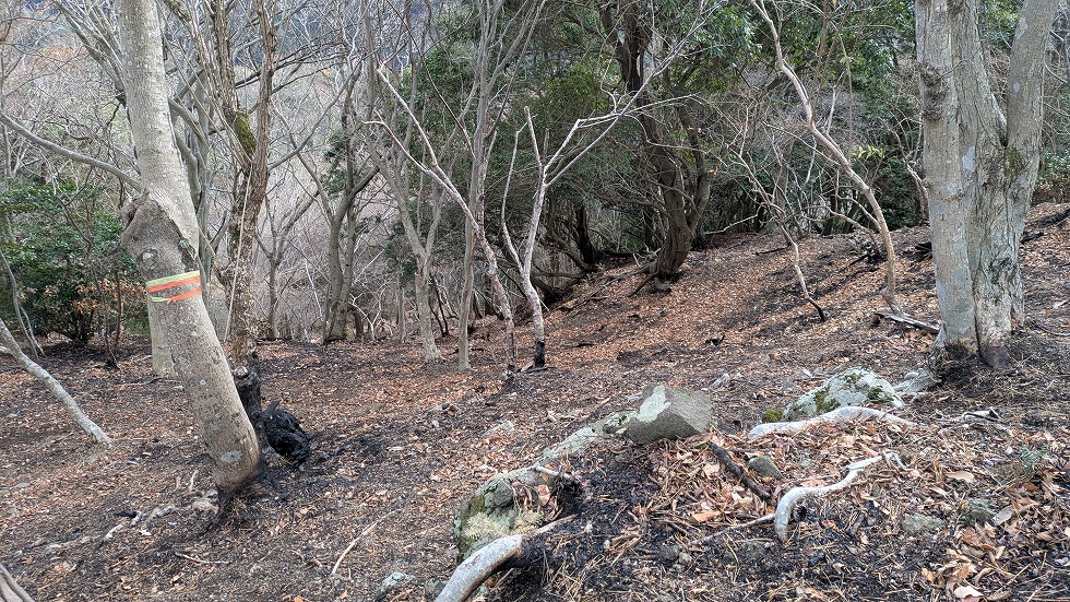 二ノ沢ノ頭の下側は山火事の影響があったようで飛び飛びに焦げていた。