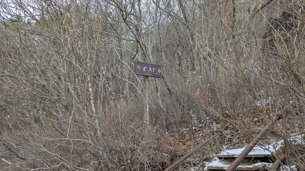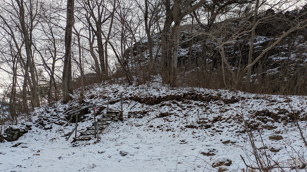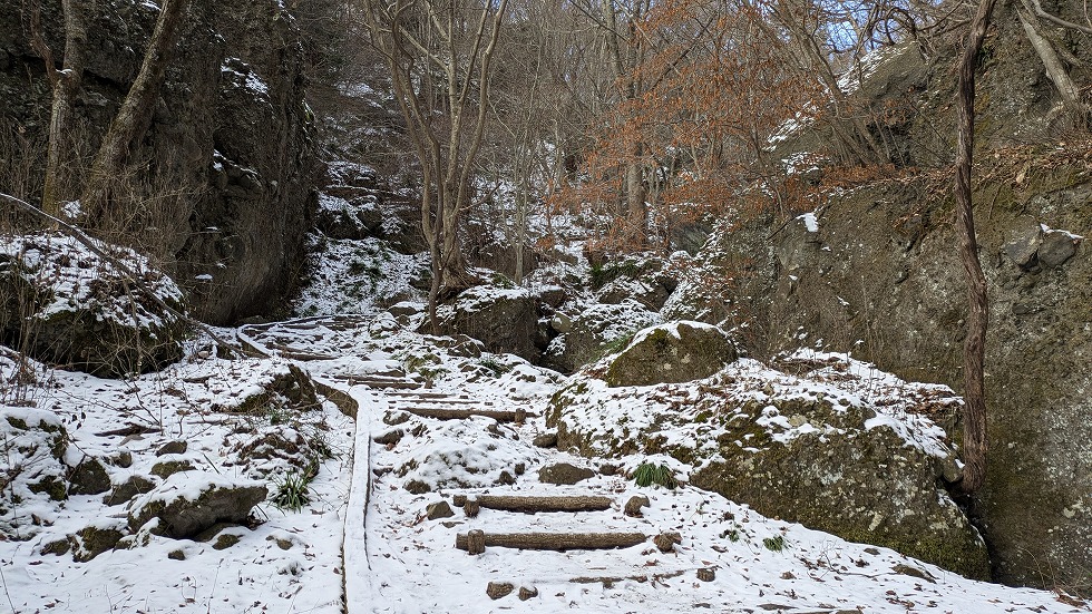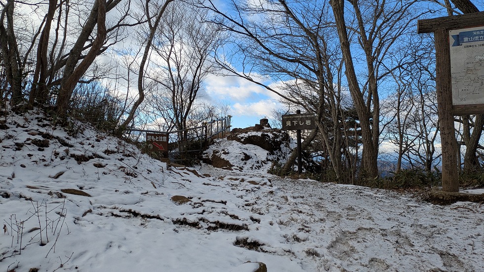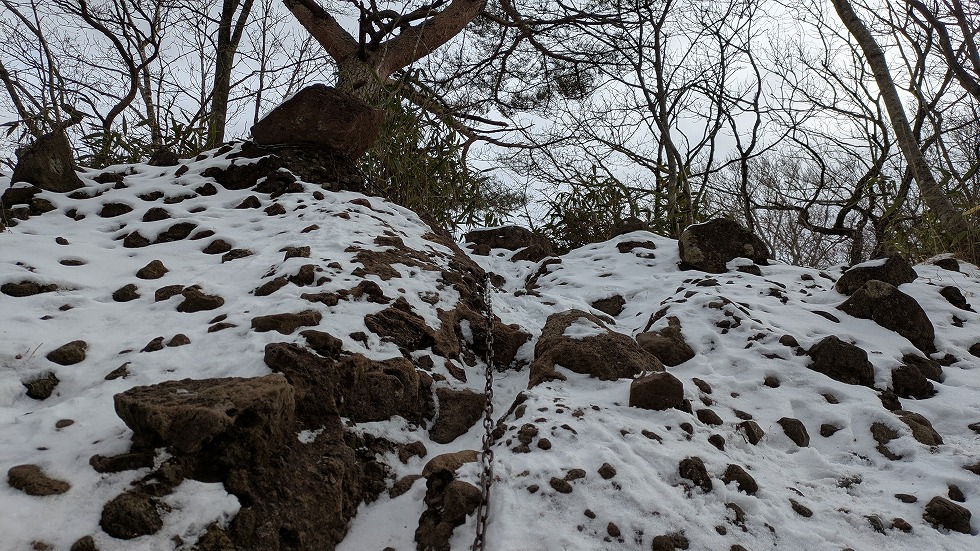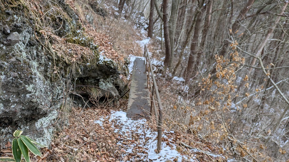 西物見岩(西ノ物見)の先は階段下りで大した角度では、なかったが雪が多く、恐る恐る下った。