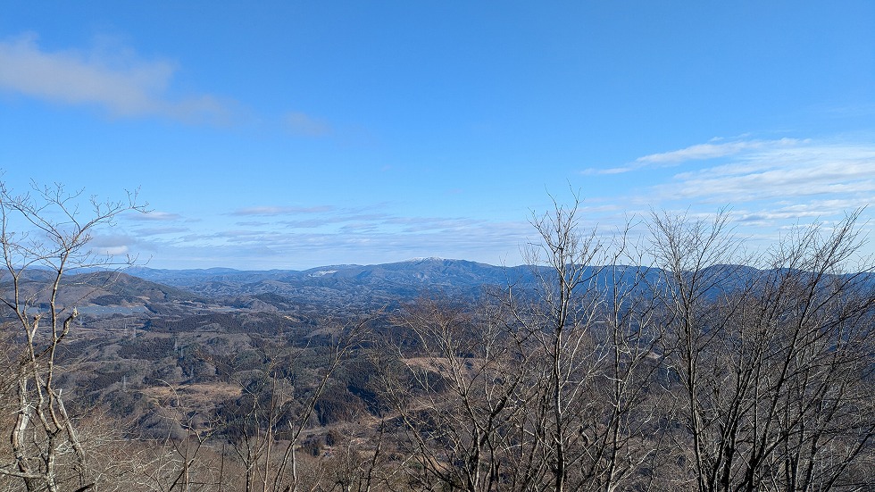 こちら(中央奥)の凸凹な山は霊山かと思っていたが後で検証すると鎌倉岳っぽい。
