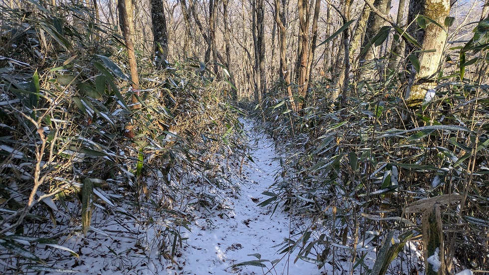 北側の登山道は明らかに登山者が少なく、単独行と思われる方の足跡が付いているだけだった。