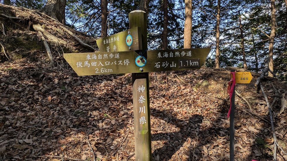 道標に巻かれた黄色いテープに石砂山・牧馬峠と書かれていた。
